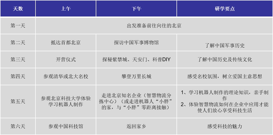 【活動內容與亮點】第一部分:名校勵志情迷名校:圓夢清華大學,感受文墨書香。 走進清華大學,親臨荷塘月色、水木清華的勝景;置身古老而又現代的世界名校,品位滄桑歷史,厚重人文和濃郁的學術氛圍,立志奮發圖強。與大學生交流互動,做一回清華學子。 第二部分:文化之行 1、傳承傳統文化——看演出、品藝術、做手工(相聲、學快板、做毛猴)坐在文化之都的劇場內,真真切切地欣賞精彩絕倫的曲藝表演, 感受藝術的鮮活。沒有電視屏幕的阻隔,觀眾將與演員同呼吸共命運,演員們的一招一式、一顰一笑都將牽動每一位觀眾的心靈…… 2、國學*開筆禮——了解孔廟*國子監,教導同學們尊師重教、孝順父母。皇帝祭祀孔子的場所和中央學府,又稱國子學或國子寺。游皇家學府,拜謁孔圣,誦讀弟子規,換禮儀制服,行開筆之禮,經過“正衣冠”等環節,對學生進行啟蒙,教導同學們尊師重教、孝順父母。 3、城市獵人——胡同文化的穿越穿越老北京胡同,走進四合院,了解老北京人的北京生活。 4、國粹藝術永流傳——戲曲基地體驗傳統文化的傳承與創新,最具代表性的就是戲曲。咿咿呀呀的唱、念、做、打會帶你穿行在國粹的藝術魅力中,穿戲服、學動作、上彩妝.....讓你深深的體會到民族的才是世界的! 第三部分:主題教育實踐活動 1、皇宮探秘——了解皇家文化,學習明清歷史故宮是我國古代宮城發展史上現存的唯一實例和最高典范,在建筑技術和建筑藝術上代表了中國古代官式建筑的最高水平。她是歷史的縮影,是中國文化傳統的結晶,是源遠流長的中華文明的見證與載體。 2、烽火連天——了解長城文化,感受長城偉大本活動由“軍情速遞”、“兵臨城下”、“大兵小將”、誦讀《少年中國說》、勵志簽名等一系列環節組成,將讓營員有一次非常的珍貴體驗。 3、探訪博物館——用眼睛看歷史,用耳朵聽往昔,用心學知識博物館是孩子的第二課堂,參觀博物館可以拓展課外知識面,豐富歷史文化知識,提高個人素養。那不可復制的珍貴遺產,值得我們每一個人去了解、學習和欣賞。 第四部分:驚喜服務