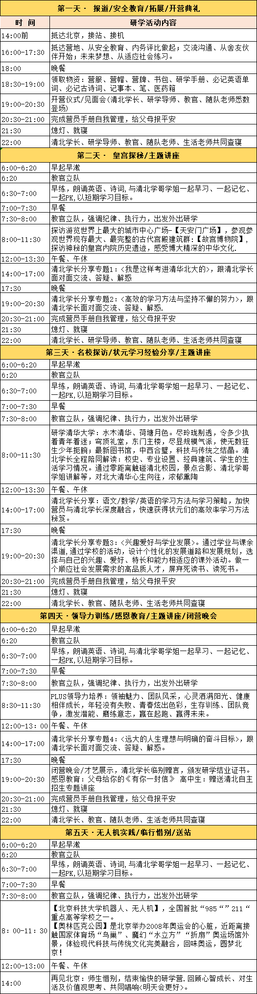 ? ? ? ? ? ? ? ? ? ? ? ? ? ?晚上·領取物資:營服、營帽、營牌、書包、研學手冊、必記英語單詞、必記古詩詞、記事本、筆、醫藥箱;【開營儀式】/見面會(清北學長、研學導師、教官、隨隊老師悉數登場)。完成營員手冊自我管理,給父母報平安。熄燈、就寢,清北學長、研學導師、教官、隨隊老師、生活老師共同查寢。